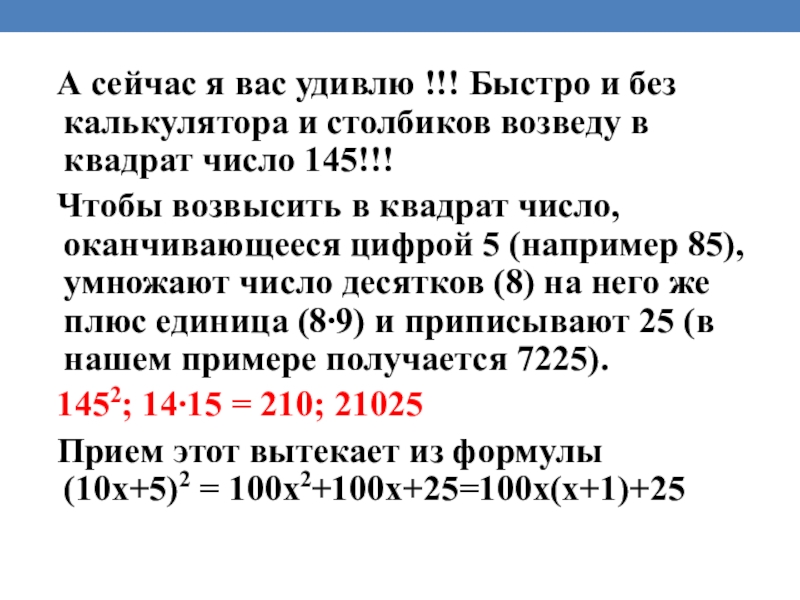 Чтобы возвысить в квадрат число, оканчивающееся цифрой 5 (например 85), умножают число десятков (8) на него же плюс единица (8∙9) и приписывают 25 (в нашем примере получается 7225).