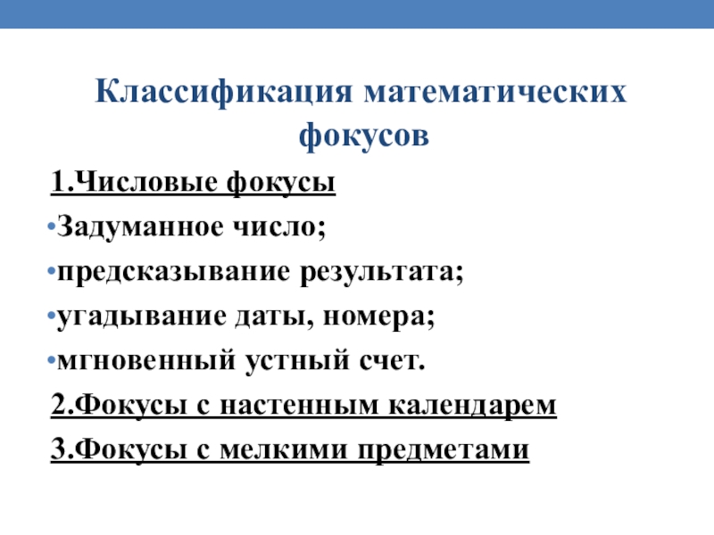 Слайд 11 Классификация математических фокусов