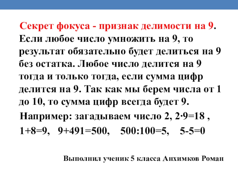 Слайд 30 Секрет фокуса - признак делимости на 9. Если любое число