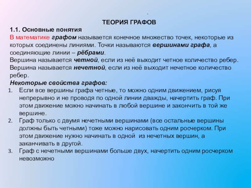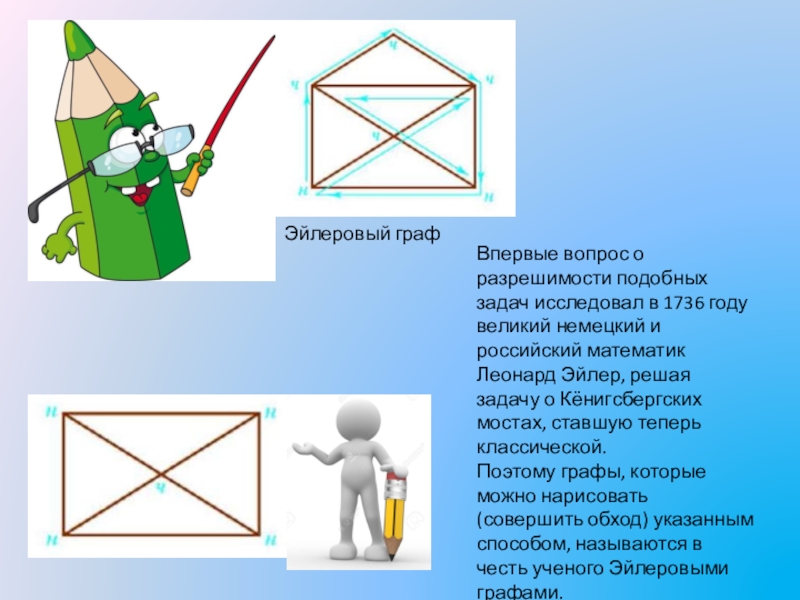Решение. Два берега и два острова примем за четыре вершины графа, а мосты будут ребрами графа. Получается, что все 4 вершины графа – нечетные. Значит, нельзя пройти по всем семи мостам ровно 1 раз.