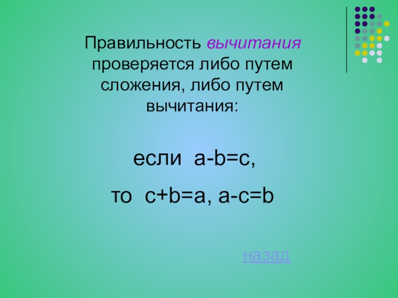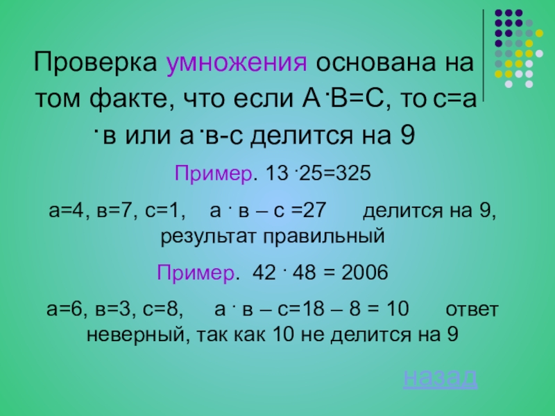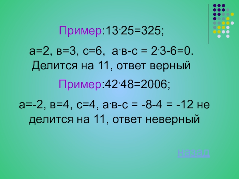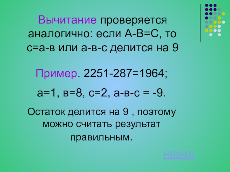 а=6, в=3, с=8, а . в – с=18 – 8 = 10 ответ неверный, так как 10 не делится на 9