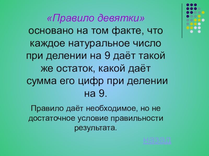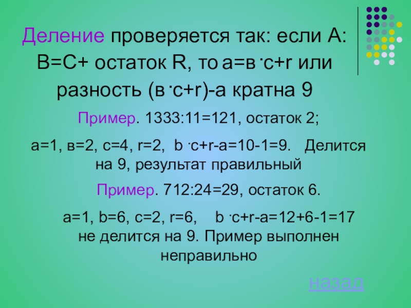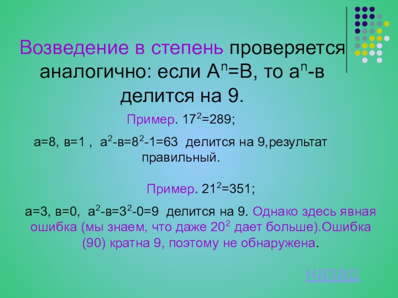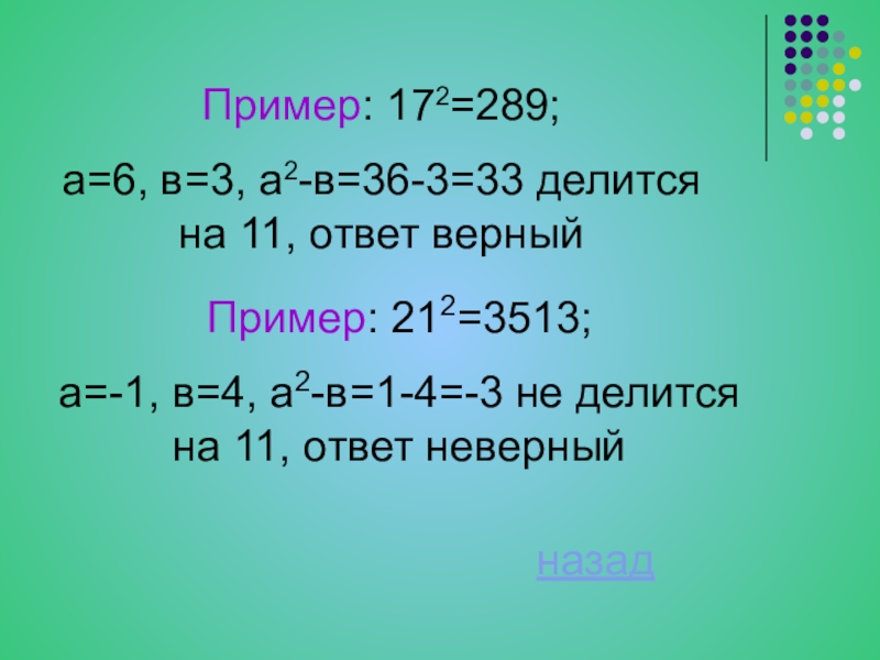 а=3, в=0, а2-в=32-0=9 делится на 9. Однако здесь явная ошибка (мы знаем, что даже 202 дает больше).Ошибка (90) кратна 9, поэтому не обнаружена.
