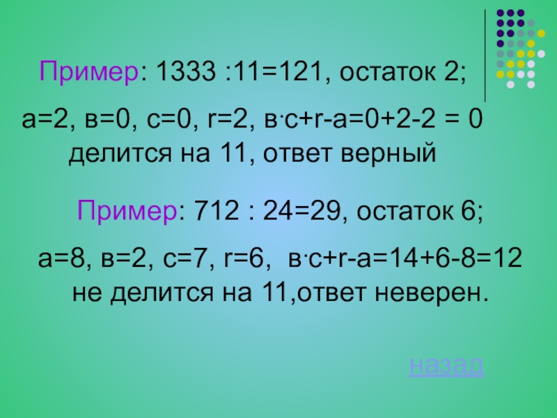 а=8, в=2, с=7, r=6, в.с+r-а=14+6-8=12 не делится на 11,ответ неверен.