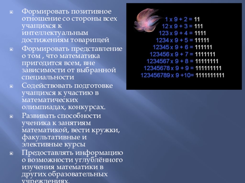 Развивать способности ученика к занятиям математикой, вести кружки, факультативные и элективные курсы