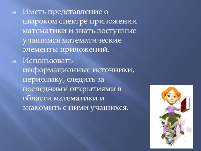 Слайд 6Иметь представление о широком спектре приложений математики и знать доступные учащимся