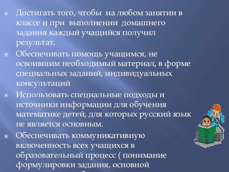 Слайд 10Достигать того, чтобы на любом занятии в классе и при выполнении