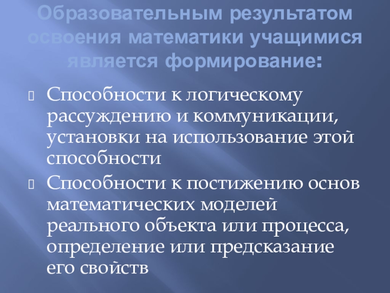 Слайд 3Образовательным результатом освоения математики учащимися является формирование: