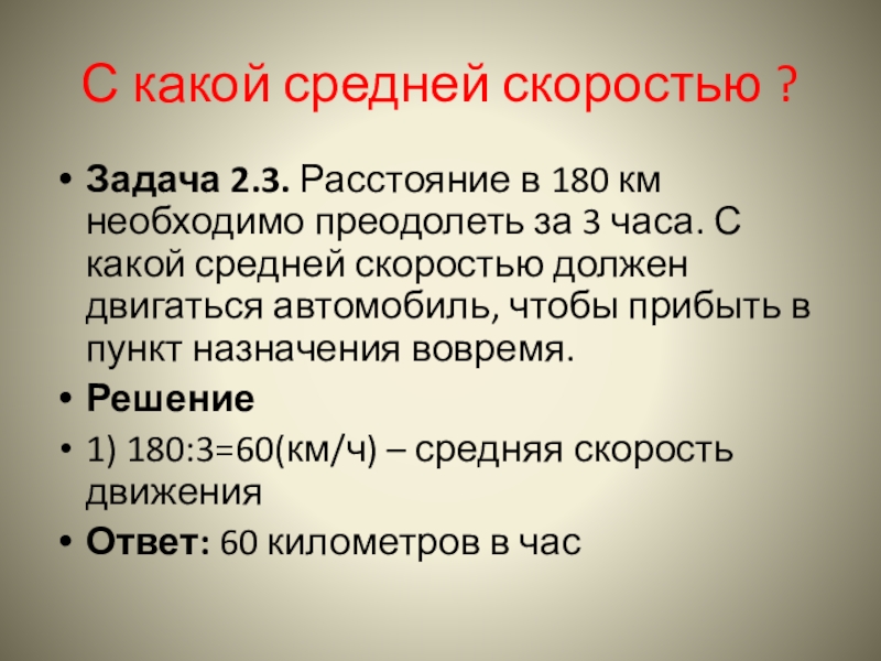 необходимо преодолеть за 3 часа. С какой средней скоростью должен двигаться автомобиль, чтобы прибыть в пункт назначения вовремя.