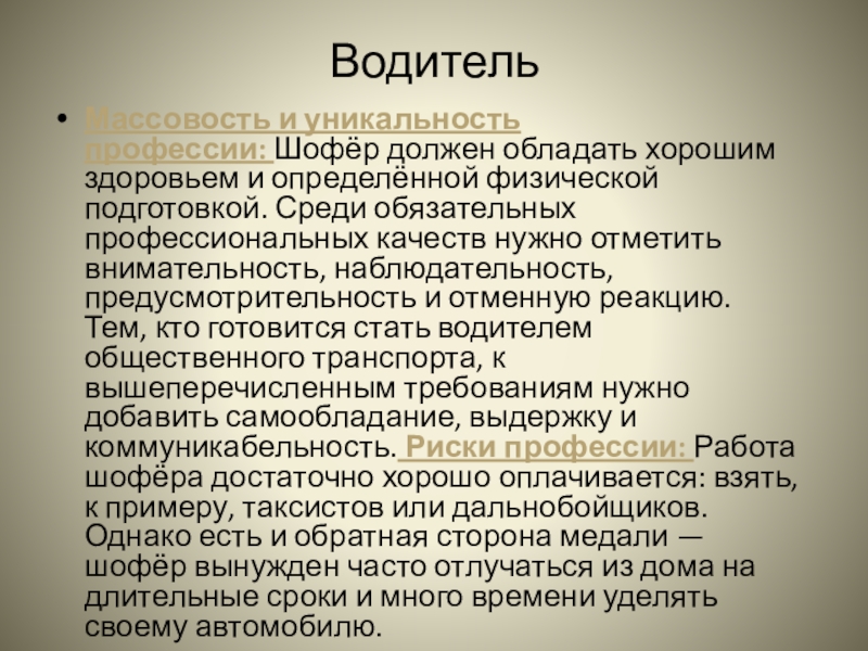 Массовость и уникальность профессии: Шофёр должен обладать хорошим здоровьем и определённой физической