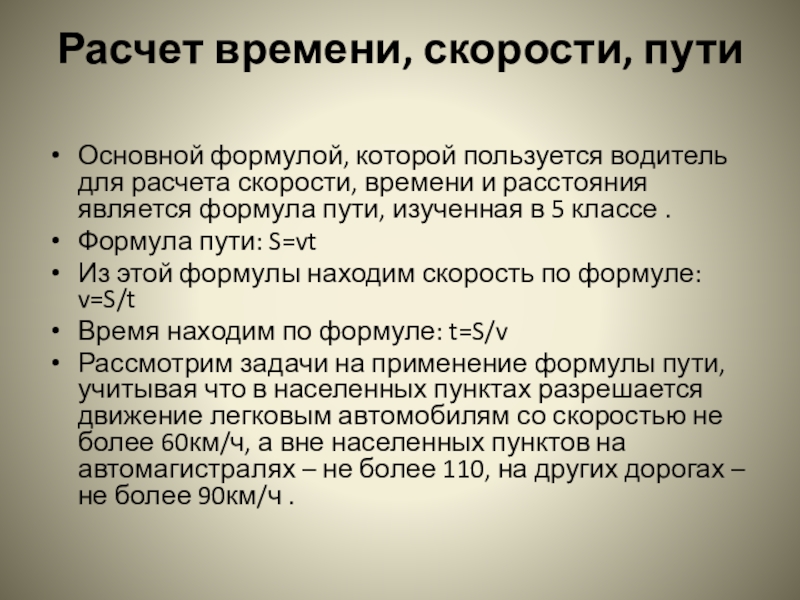 Рассмотрим задачи на применение формулы пути, учитывая что в населенных пунктах разрешается движение легковым автомобилям со скоростью не более 60км/ч, а вне населенных пунктов на автомагистралях – не более 110, на других дорогах – не более 90км/ч .