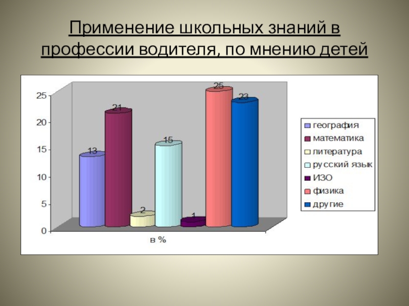 Слайд 16Применение школьных знаний в профессии водителя, по мнению детей