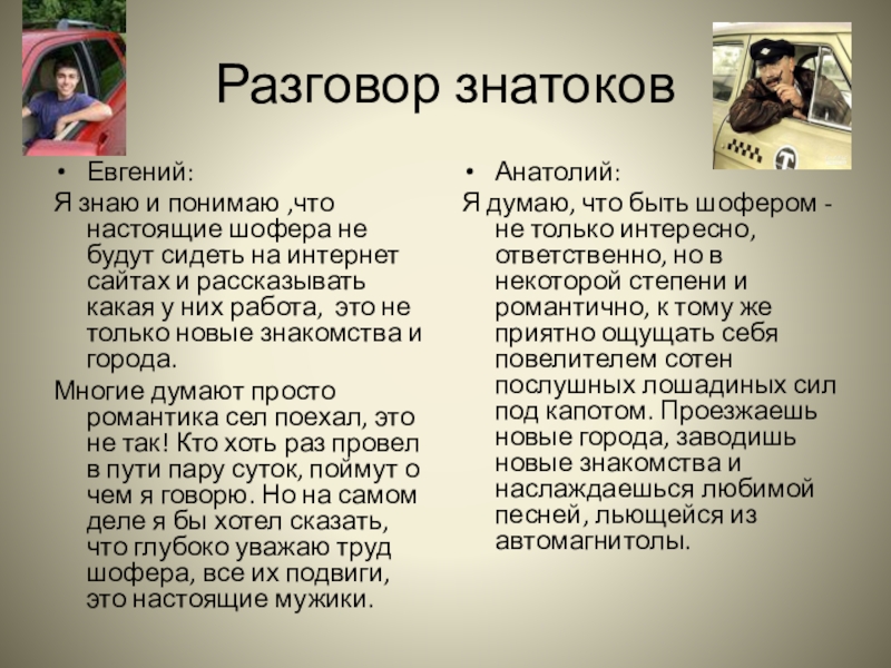 Евгений: Я работаю водителем уже 10 лет, я люблю свою работу, приятно вечером ехать в машине и слушать любимую музыку. Но если честно первые годы моей работы была проблема, в школе и в институте, я не очень любил математику, а в работе водителем она мне очень пригодилась, поэтому учите математику!