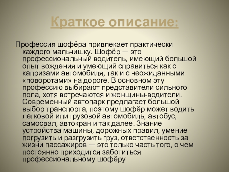 водитель, имеющий большой опыт вождения и умеющий справиться как с капризами автомобиля, так и с неожиданными «поворотами» на дороге. В основном эту профессию выбирают представители сильного пола, хотя встречаются и женщины-водители. Современный автопарк предлагает большой выбор транспорта, поэтому шофёр может водить легковой или грузовой автомобиль, автобус, самосвал, автокран и так далее. Знание устройства машины, дорожных правил, умение погрузить и разгрузить груз, ответственность за жизни пассажиров — это только часть того, о чем постоянно приходится заботиться профессиональному шофёру