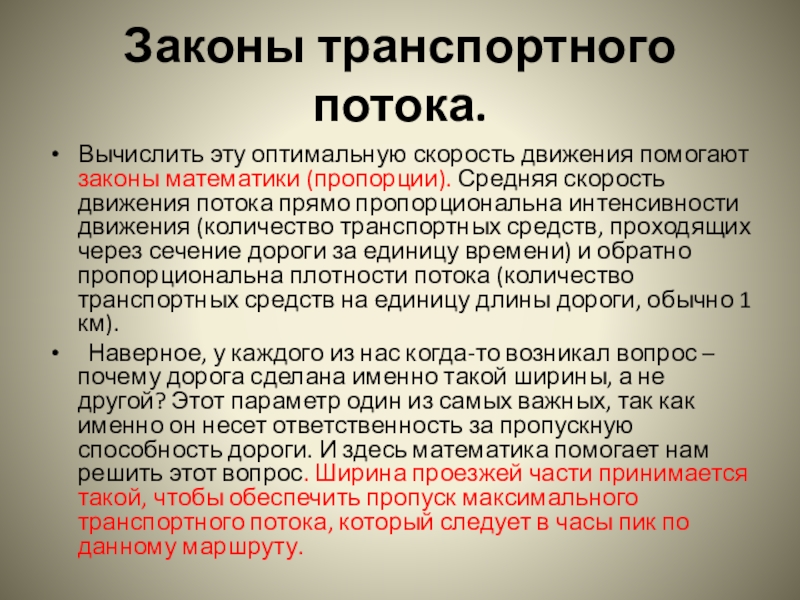 Наверное, у каждого из нас когда-то возникал вопрос – почему дорога сделана именно такой ширины, а не другой? Этот параметр один из самых важных, так как именно он несет ответственность за пропускную способность дороги. И здесь математика помогает нам решить этот вопрос. Ширина проезжей части принимается такой, чтобы обеспечить пропуск максимального транспортного потока, который следует в часы пик по данному маршруту.