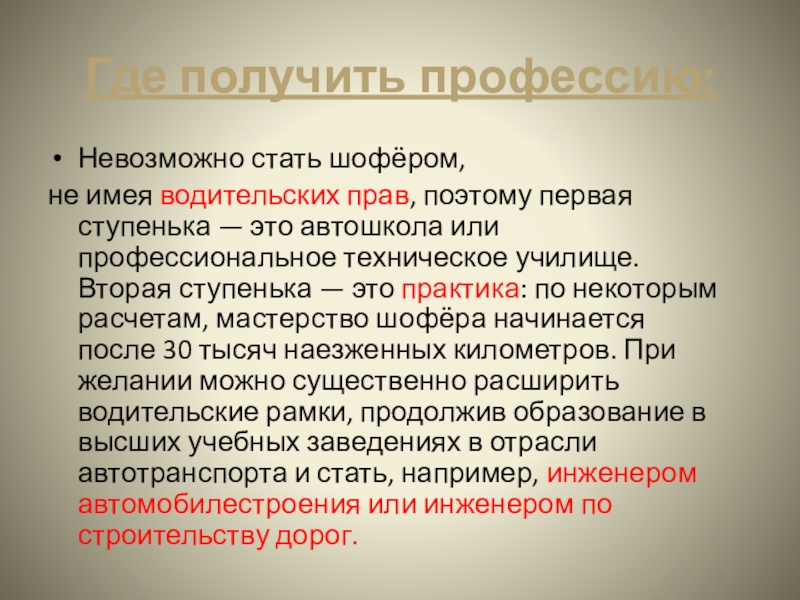 ступенька — это автошкола или профессиональное техническое училище. Вторая ступенька — это практика: по некоторым расчетам, мастерство шофёра начинается после 30 тысяч наезженных километров. При желании можно существенно расширить водительские рамки, продолжив образование в высших учебных заведениях в отрасли автотранспорта и стать, например, инженером автомобилестроения или инженером по строительству дорог.