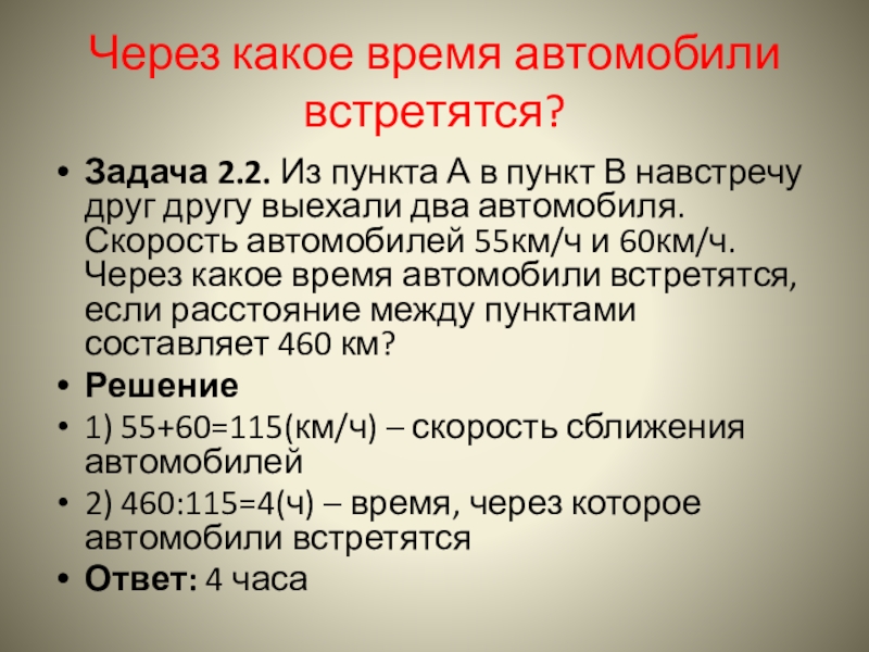 2) 460:115=4(ч) – время, через которое автомобили встретятся