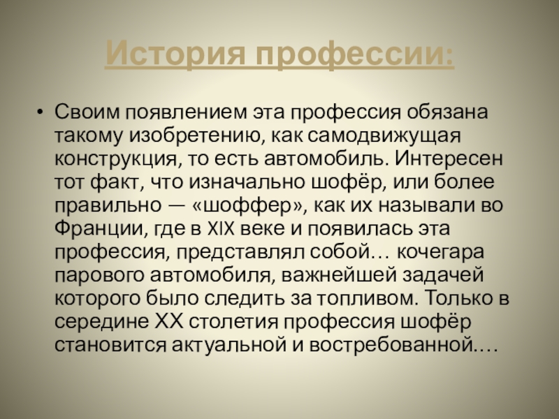 то есть автомобиль. Интересен тот факт, что изначально шофёр, или более правильно — «шоффер», как их называли во Франции, где в XIX веке и появилась эта профессия, представлял собой… кочегара парового автомобиля, важнейшей задачей которого было следить за топливом. Только в середине ХХ столетия профессия шофёр становится актуальной и востребованной.…