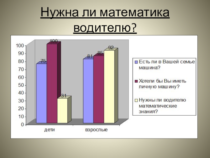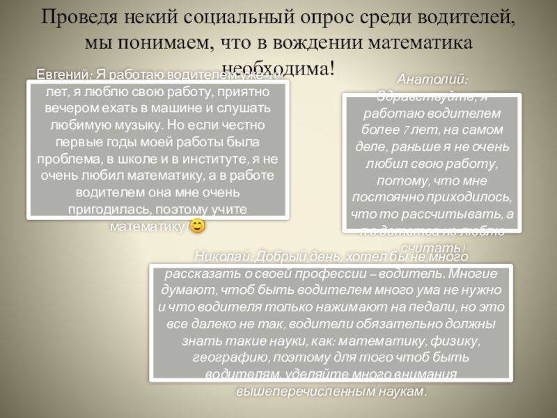 Слайд 14Проведя некий социальный опрос среди водителей, мы понимаем, что в вождении