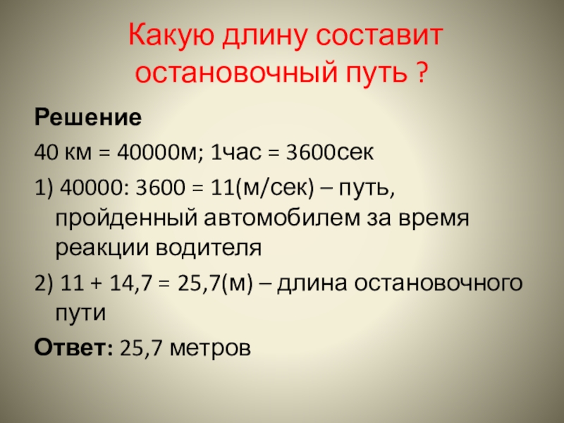 2) 11 + 14,7 = 25,7(м) – длина остановочного пути