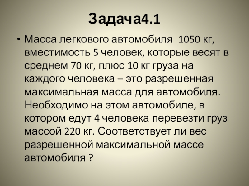 среднем 70 кг, плюс 10 кг груза на каждого человека – это разрешенная максимальная масса для автомобиля. Необходимо на этом автомобиле, в котором едут 4 человека перевезти груз массой 220 кг. Соответствует ли вес разрешенной максимальной массе автомобиля ?