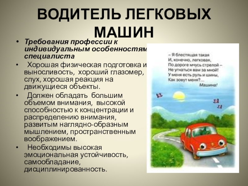 Слайд 19ВОДИТЕЛЬ ЛЕГКОВЫХ МАШИН