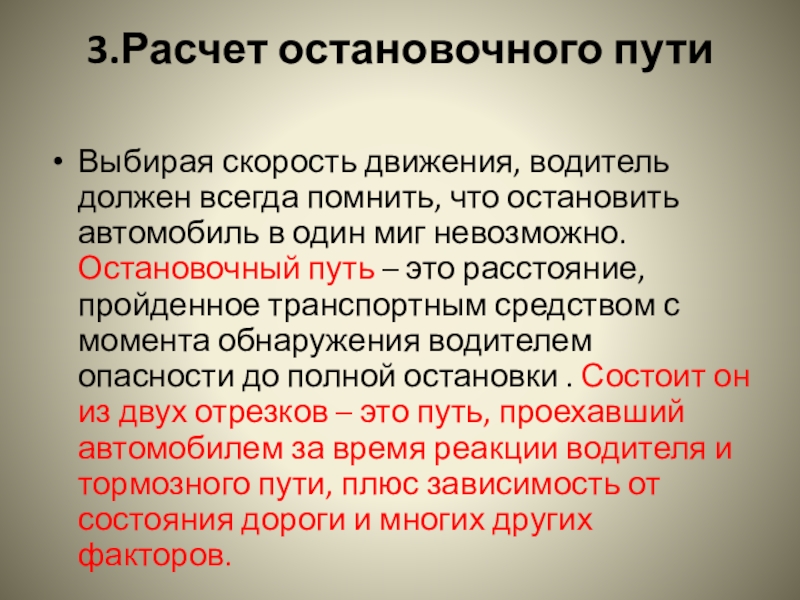 автомобиль в один миг невозможно. Остановочный путь – это расстояние, пройденное транспортным средством с момента обнаружения водителем опасности до полной остановки . Состоит он из двух отрезков – это путь, проехавший автомобилем за время реакции водителя и тормозного пути, плюс зависимость от состояния дороги и многих других факторов.