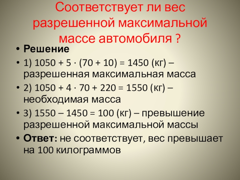 Слайд 41Соответствует ли вес разрешенной максимальной массе автомобиля ?