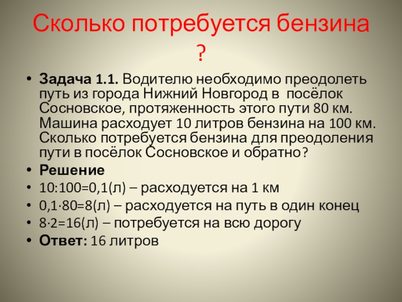 Нижний Новгород в посёлок Сосновское, протяженность этого пути 80 км. Машина расходует 10 литров бензина на 100 км. Сколько потребуется бензина для преодоления пути в посёлок Сосновское и обратно?