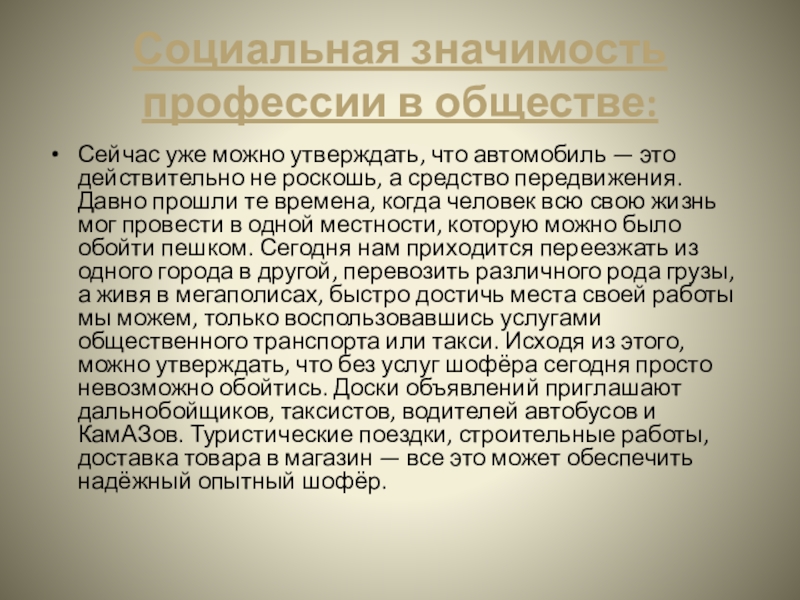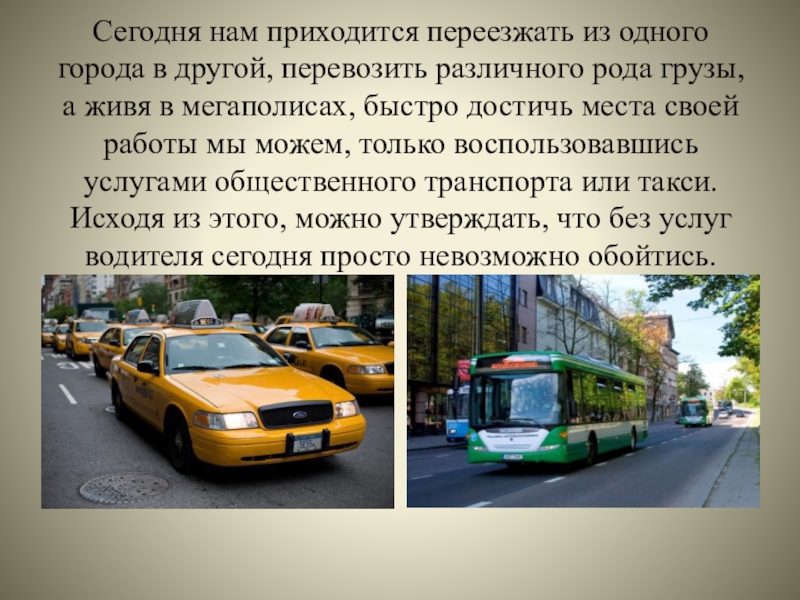 рода грузы, а живя в мегаполисах, быстро достичь места своей работы мы можем, только воспользовавшись услугами общественного транспорта или такси. Исходя из этого, можно утверждать, что без услуг водителя сегодня просто невозможно обойтись.