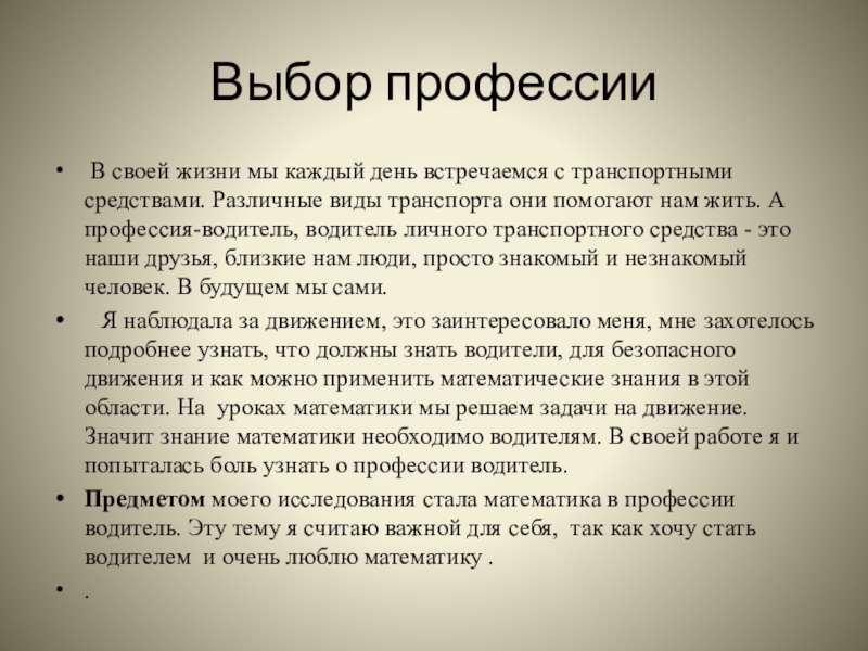 Я наблюдала за движением, это заинтересовало меня, мне захотелось подробнее узнать, что должны знать водители, для безопасного движения и как можно применить математические знания в этой области. На уроках математики мы решаем задачи на движение. Значит знание математики необходимо водителям. В своей работе я и попыталась боль узнать о профессии водитель.