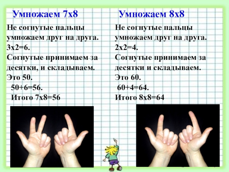 Не согнутые пальцы умножаем друг на друга. 2х2=4.