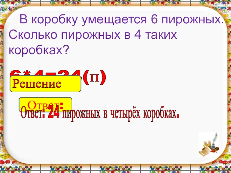 Ответ: 24 пирожных в четырёх коробках.