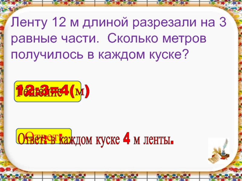 Ответ: в каждом куске 4 м ленты.
