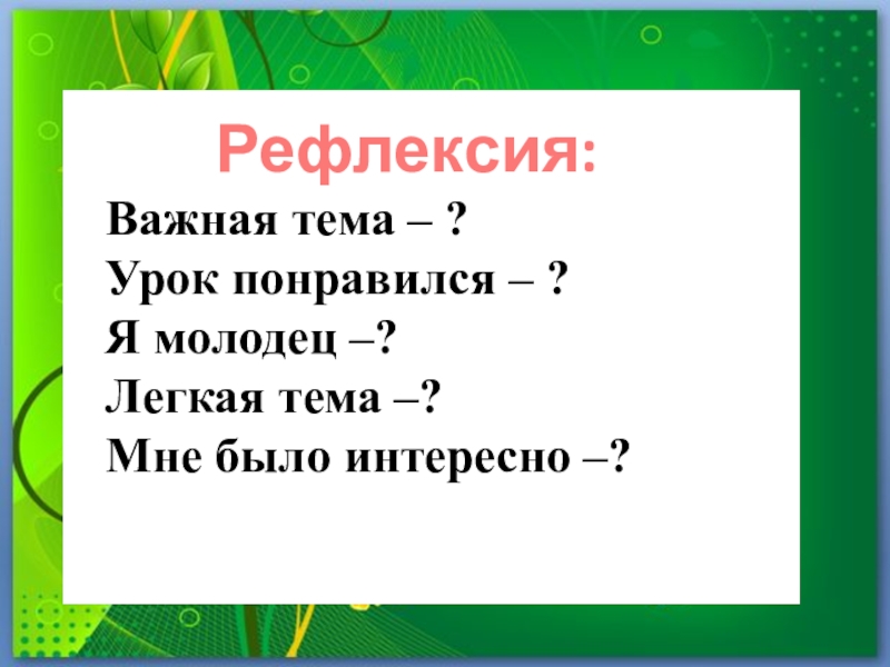 Рефлексия:Важная тема – ?Урок понравился – ?Я молодец –?Легкая тема –?Мне было интересно –?