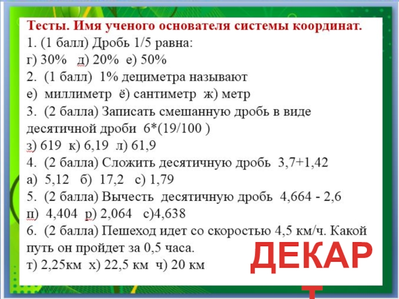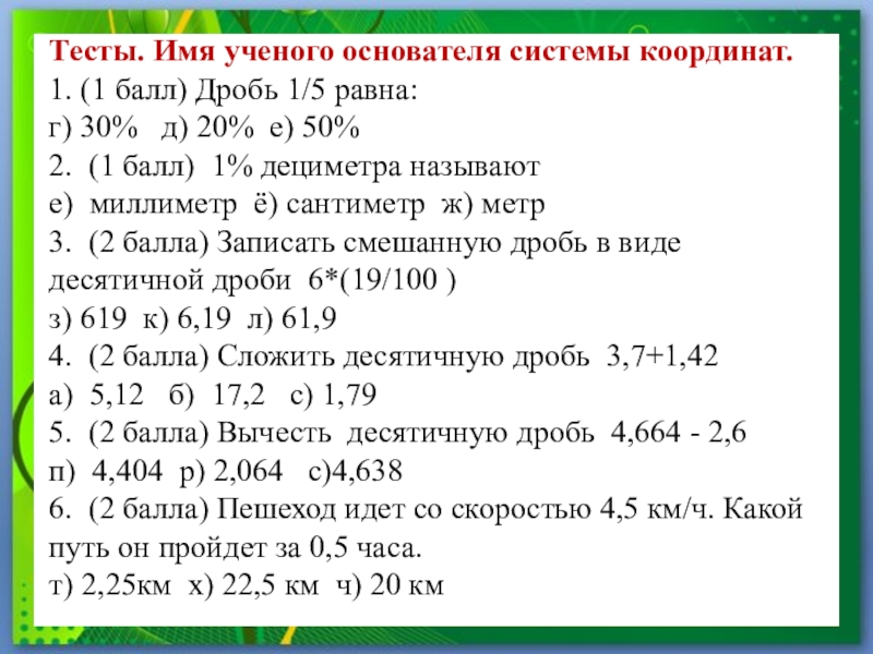 Тесты. Имя ученого основателя системы координат.1. (1 балл) Дробь 1/5 равна:г) 30%  д) 20% е) 50%2.