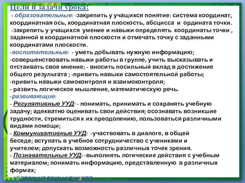- образовательные: -закрепить у учащихся понятие: система координат, координатная ось,
