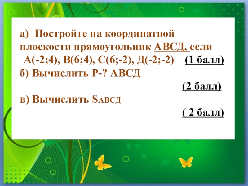 а) Постройте на координатной плоскости прямоугольник АВСД, если А(-2;4), В(6;4), С(6;-2), Д(-2;-2)  (1 балл)б) Вычислить Р-?