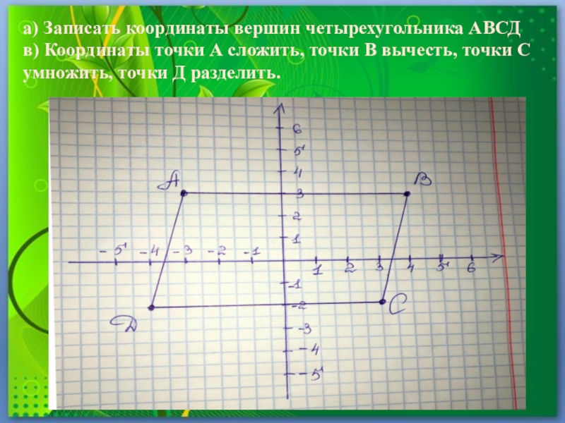 а) Записать координаты вершин четырехугольника АВСДв) Координаты точки А сложить, точки В вычесть, точки С умножить, точки