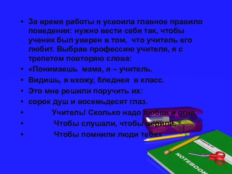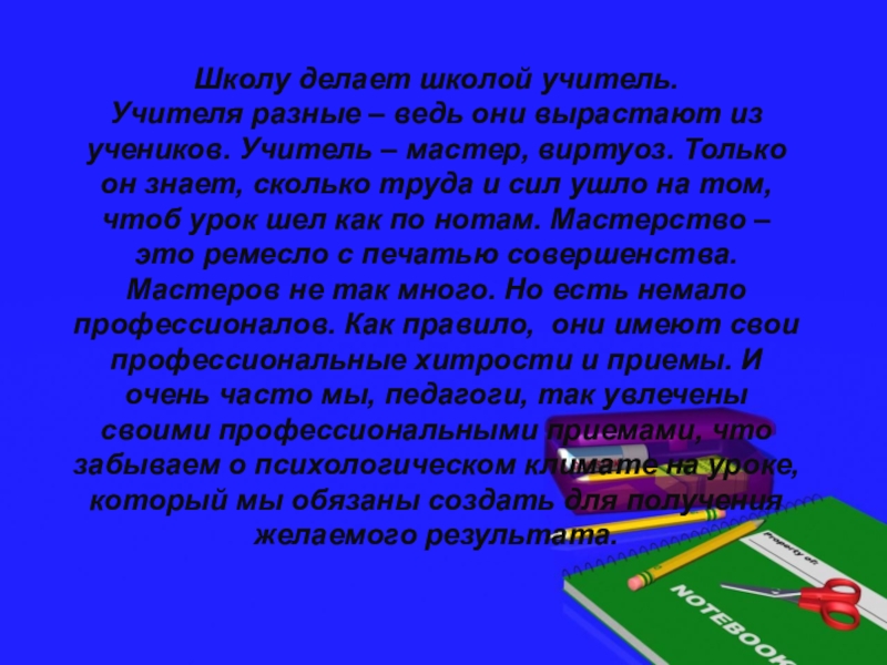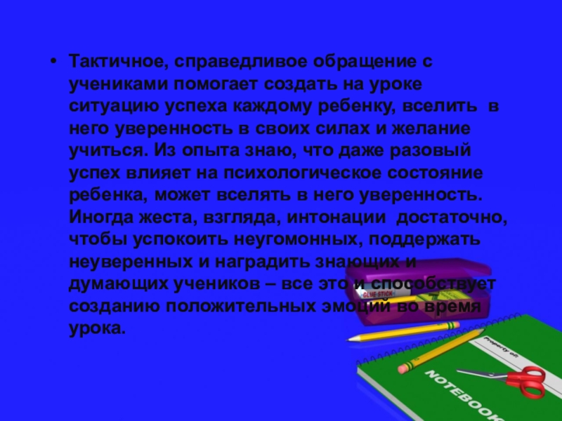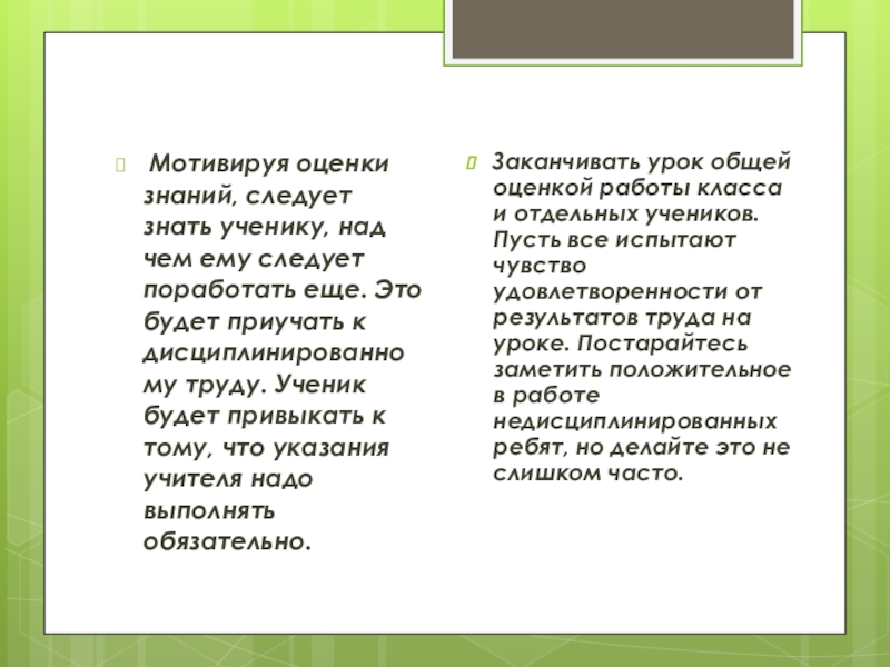 Заканчивать урок общей оценкой работы класса и отдельных учеников. Пусть все испытают чувство удовлетворенности от результатов труда на уроке. Постарайтесь заметить положительное в работе недисциплинированных ребят, но делайте это не слишком часто.