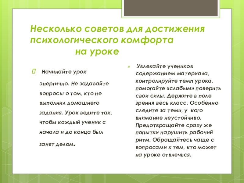 Начинайте урок энергично. Не задавайте вопросы о том, кто не выполнил домашнего задания. Урок ведите так, чтобы каждый ученик с начала и до конца был занят делом.