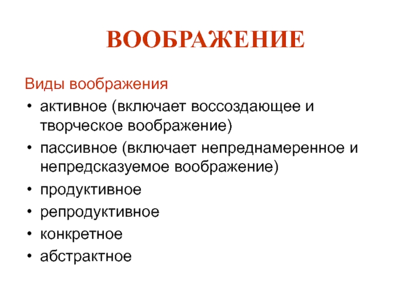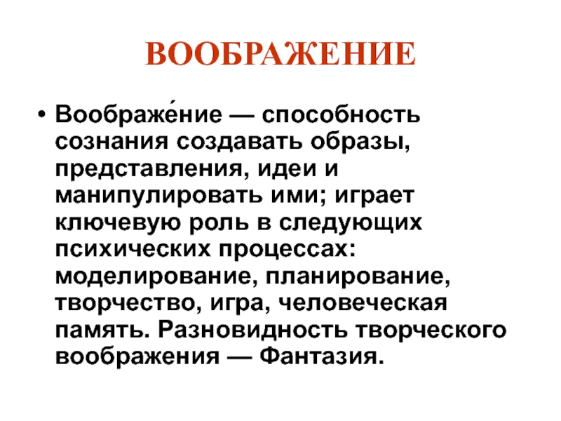 играет ключевую роль в следующих психических процессах: моделирование, планирование, творчество, игра, человеческая память. Разновидность творческого воображения — Фантазия.