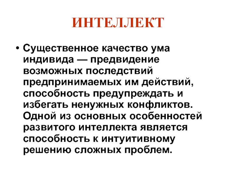 способность предупреждать и избегать ненужных конфликтов. Одной из основных особенностей развитого интеллекта является способность к интуитивному решению сложных проблем.