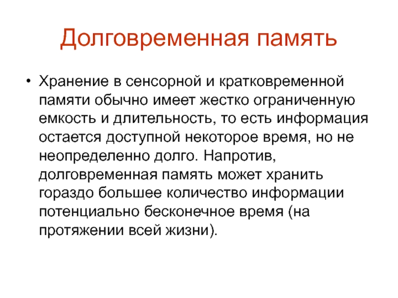 емкость и длительность, то есть информация остается доступной некоторое время, но не неопределенно долго. Напротив, долговременная память может хранить гораздо большее количество информации потенциально бесконечное время (на протяжении всей жизни).