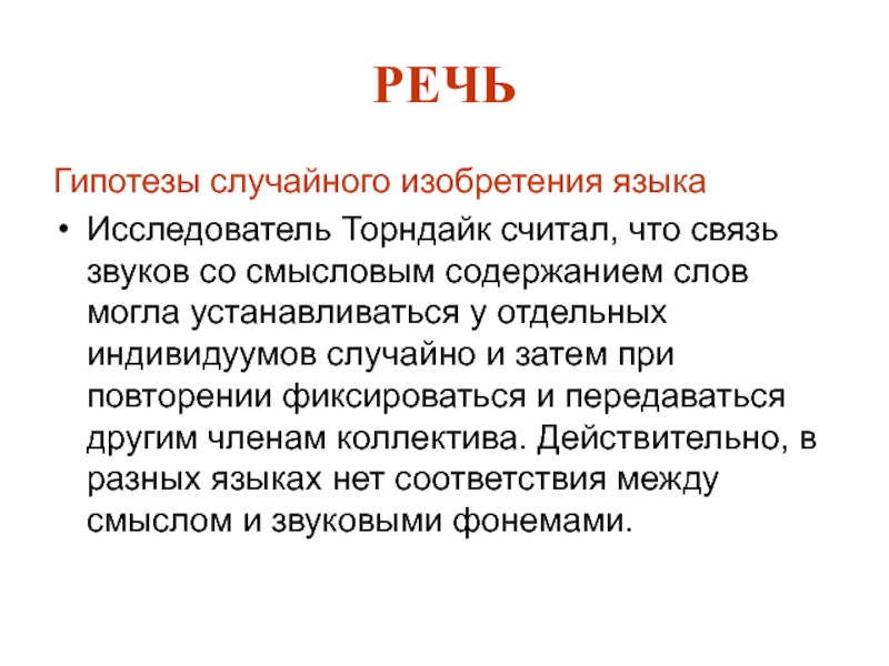содержанием слов могла устанавливаться у отдельных индивидуумов случайно и затем при повторении фиксироваться и передаваться другим членам коллектива. Действительно, в разных языках нет соответствия между смыслом и звуковыми фонемами.
