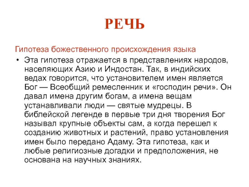 и Индостан. Так, в индийских ведах говорится, что установителем имен является Бог — Всеобщий ремесленник и «господин речи». Он давал имена другим богам, а имена вещам устанавливали люди — святые мудрецы. В библейской легенде в первые три дня творения Бог называл крупные объекты сам, а когда перешел к созданию животных и растений, право установления имен было передано Адаму. Эта гипотеза, как и любые религиозные догадки и предположения, не основана на научных знаниях.