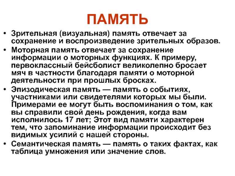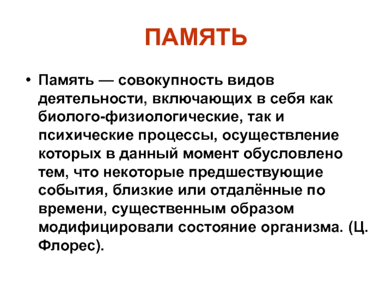Слайд 3Память — совокупность видов деятельности, включающих в себя как биолого-физиологические, так
