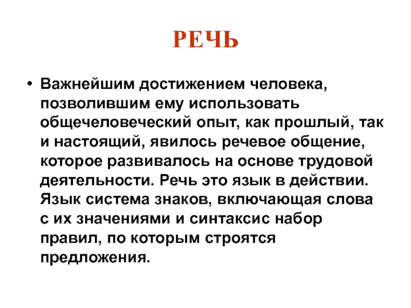 и настоящий, явилось речевое общение, которое развивалось на основе трудовой деятельности. Речь это язык в действии. Язык система знаков, включающая слова с их значениями и синтаксис набор правил, по которым строятся предложения.