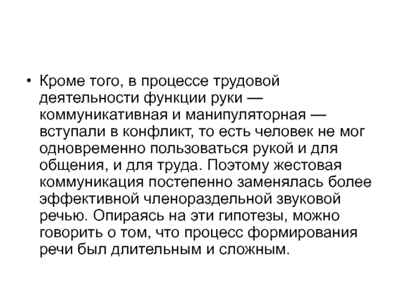 манипуляторная — вступали в конфликт, то есть человек не мог одновременно пользоваться рукой и для общения, и для труда. Поэтому жестовая коммуникация постепенно заменялась более эффективной членораздельной звуковой речью. Опираясь на эти гипотезы, можно говорить о том, что процесс формирования речи был длительным и сложным.