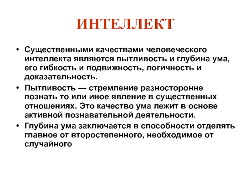 Существенными качествами человеческого интеллекта являются пытливость и глубина ума, его гибкость