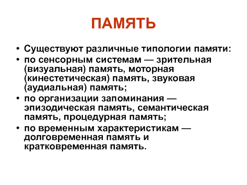 по организации запоминания — эпизодическая память, семантическая память, процедурная память;